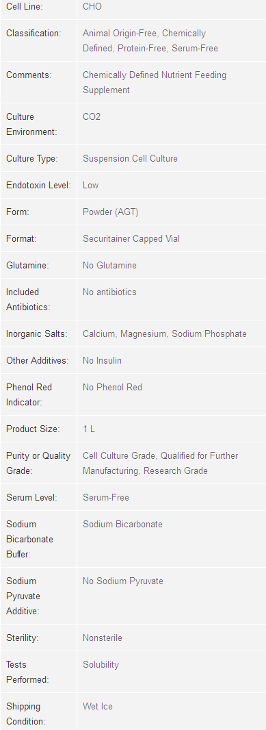 GIBCO® CD EfficientFeed™ C AGT™ nutrient supplement is a dry format single part supplement for fed batch addition to the culture of multiple cell lines. This product is designed to work with GS CHO cell lines as a single feed without the need for additional GS supplements. CD EfficientFeed™ C AGT™ nutritient supplement is an animal origin-free, chemically defined formulation that contains no proteins, hydrolysates, or components of incompletely defined composition.