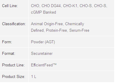 Gibco® EfficientFeed™ A+ (Plus) AGT™ Supplement is a dry-format single-part supplement for fed batch addition to the culture of multiple cell lines to assist with process development and maximization of bioreactor utilization. Compared to original CHO CD EfficientFeed™ A AGT™ nutrient supplement, EfficientFeed™ A+ supplement has components that are uniquely combined to allow simpler single-part pH-neutral reconstitution, as well as the ability to super-concentrate the supplement from 66.4 g/L (1X) to 199.2 g/L (3X) for reduction of product dilution or increased titers with additional feeding, when appropriate. The product is an animal origin-free, chemically defined formulation that contains no proteins, hydrolysates, or components of incompletely defined composition.