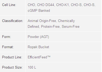 Gibco® EfficientFeed™ A+ (Plus) AGT™ Supplement is a dry-format single-part supplement for fed batch addition to the culture of multiple cell lines to assist with process development and maximization of bioreactor utilization. Compared to original CHO CD EfficientFeed™ A AGT™ nutrient supplement, EfficientFeed™ A+ supplement has components that are uniquely combined to allow simpler single-part pH-neutral reconstitution, as well as the ability to super-concentrate the supplement from 66.4 g/L (1X) to 199.2 g/L (3X) for reduction of product dilution or increased titers with additional feeding, when appropriate. The product is an animal origin-free, chemically defined formulation that contains no proteins, hydrolysates, or components of incompletely defined composition.