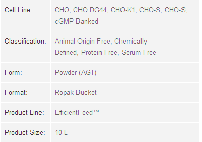 Gibco® EfficientFeed™ A+ (Plus) AGT™ Supplement is a dry-format single-part supplement for fed batch addition to the culture of multiple cell lines to assist with process development and maximization of bioreactor utilization. Compared to original CHO CD EfficientFeed™ A AGT™ nutrient supplement, EfficientFeed™ A+ supplement has components that are uniquely combined to allow simpler single-part pH-neutral reconstitution, as well as the ability to super-concentrate the supplement from 66.4 g/L (1X) to 199.2 g/L (3X) for reduction of product dilution or increased titers with additional feeding, when appropriate. The product is an animal origin-free, chemically defined formulation that contains no proteins, hydrolysates, or components of incompletely defined composition.