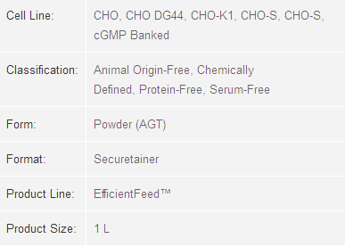 • You have used CHO CD EfficientFeed™ A supplement in the past and wish to explore simpler reconstitution and super-concentration benefits of new technology for delivery of key components