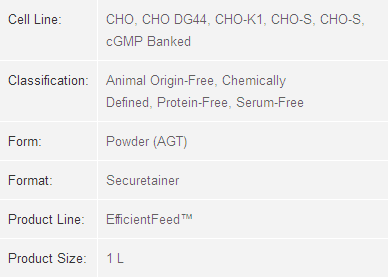 Gibco® EfficientFeed™ C+ (Plus) AGT™ Supplement is a dry-format single-part supplement for fed batch addition to the culture of multiple cell lines to assist with process development and maximization of bioreactor utilization. This product is designed to work with CHO cell lines expressing endogenous glutamine synthetase (GS) as a single feed without the need for additional GS supplements. Compared to the original CD EfficientFeed™ C AGT™ nutrient supplement, EfficientFeed™ C+ supplement has components that are uniquely combined to allow simpler pH-neutral reconstitution, as well as the ability to super-concentrate the supplement from 81.2 g/L (1X) to 162.4 g/L (2X) for reduction of product dilution or increased titers with additional feeding, when appropriate. The product is an animal origin-free, chemically defined formulation that contains no proteins, hydrolysates, or components of incompletely defined composition.