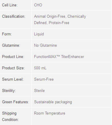 FunctionMAX™ TiterEnhancer does not introduce new ingredients to your fed-batch process; it simply provides the same key ingredients found in basal media that the cells need late in culture to maintain their productivity. Further, the technology used to combine these ingredients does not introduce any additional ingredients. Nor does it contain any growth factors or undefined components like hydrolysates. A DMF (drug master file) reference can be requested for this product for assurance of regulatory authorities that there are no substances or ingredients in the formulation that might create regulatory concerns.