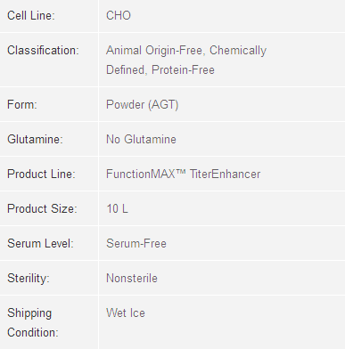FunctionMAX™ TiterEnhancer does not introduce new ingredients to your fed-batch process; it simply provides the same key ingredients found in basal media that the cells need late in culture to maintain their productivity. Further, the technology used to combine these ingredients does not introduce any additional ingredients. Nor does it contain any growth factors or undefined components like hydrolysates. A DMF (drug master file) reference can be requested for this product for assurance of regulatory authorities that there are no substances or ingredients in the formulation that might create regulatory concerns.