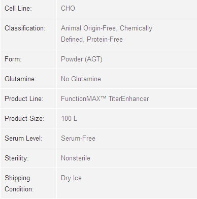 FunctionMAX™ TiterEnhancer uses a new technology to combine key nutrients in a highly concentrated (150 g/L), pH-neutral, chemically-defined, AOF (animal origin-free) functional additive that is designed to reinforce existing feeds and amplify the productivity of standard high cell density fed-batch platforms. FunctionMAX™ TiterEnhancer is available in both a liquid format and this AGT™ dry format and is stable for over 1 year. FunctionMAX™ TiterEnhancer offers:
