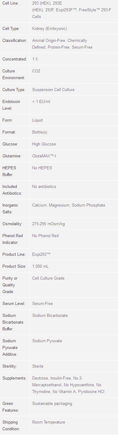 Expi293™ Expression Medium is a chemically defined, serum-free, protein-free medium for growth and transfection of suspension-adapted human embryonic kidney (HEK) 293 cells. It is specifically designed as a core component to support high density culture of Expi293F™ cells in the Expi293™ Expression System for scalable transient protein expression.