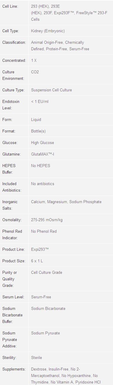 Expi293™ Expression Medium is a chemically defined, serum-free, protein-free medium for growth and transfection of suspension-adapted human embryonic kidney (HEK) 293 cells. It is specifically designed as a core component to support high density culture of Expi293F™ cells in the Expi293™ Expression System for scalable transient protein expression.