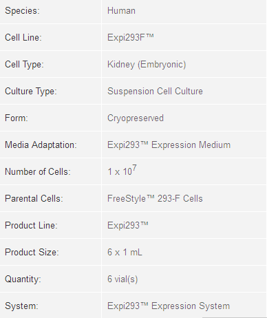 Expi293F™ human cells are derived from the 293 cell line, and are a core component of the Expi293™ Expression System. They are maintained in suspension culture and will grow to high density in Expi293™ Expression Medium. Expi293F™ cells are highly transfectable and generate superior protein yields compared to standard 293 cell lines in transient protein expression.