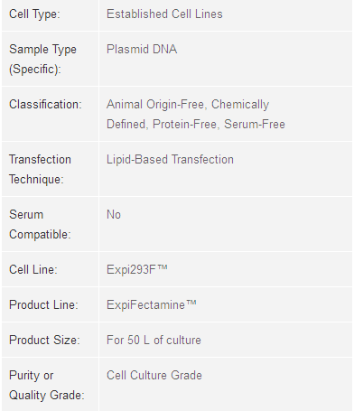 The ExpiFectamine™ 293 Transfection Kit is specifically designed to work with Expi293F™ cells in the Expi293™ Expression System. The transfection kit consists of the cationic lipid-based ExpiFectamine™ 293 Reagent and ExpiFectamine™ 293 Transfection Enhancers 1 and 2. The enhancers are added 16 to 18 hours post-transfection to boost transfection, cell viability, and protein expression. The protocol for use of ExpiFectamine™ 293 Transfection components is very similar to transfection protocols for other transient expression reagents, such as 293fectin™ and FreeStyle™ MAX.