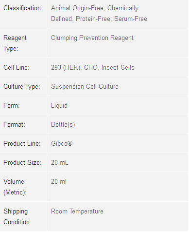 GIBCO® Anti-Clumping Agent is a concentrated liquid reagent that reduces cell clumping to assist in attaining higher viable cell densities in suspension culture. Anti-Clumping Agent is a gentle, animal origin-free, chemically defined formulation that contains no proteins, enzymes, hydrolysates, or components of unknown composition.