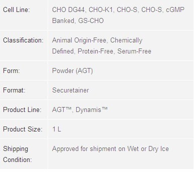 Gibco® Dynamis™ AGT™ dry format medium is specifically designed to offer the highest batch and fed-batch culture performance and yield with recombinant CHO cells in a chemically defined environment. The chemically defined, protein-free, animal origin component-free formulation provides the power to achieve high titers, start process development faster, and streamline or simplify transfer to manufacturing scale.