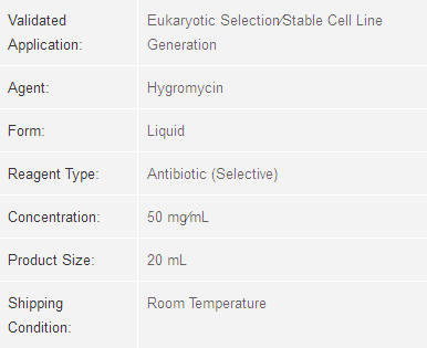 潮霉素 B 是一种氨基糖苷类抗生素,可通过中断易位并增加 80S 核糖体上的错误翻译来抑制蛋白质合成。 因为其作用方式与 Geneticin® 或 Zeocin™ 不同,所以可用于双选择实验。 大肠杆菌潮霉素抗性基因(hyg 或 hph)提供对潮霉素 B 的抗性。 选择浓度范围是 100-1000 ug/ml(通常 200 ug/ml),应针对每种细胞系进行优化。 植物转化 (1,2) 和哺乳动物转染系统 (3-5) 应用参考文献可见于下文。